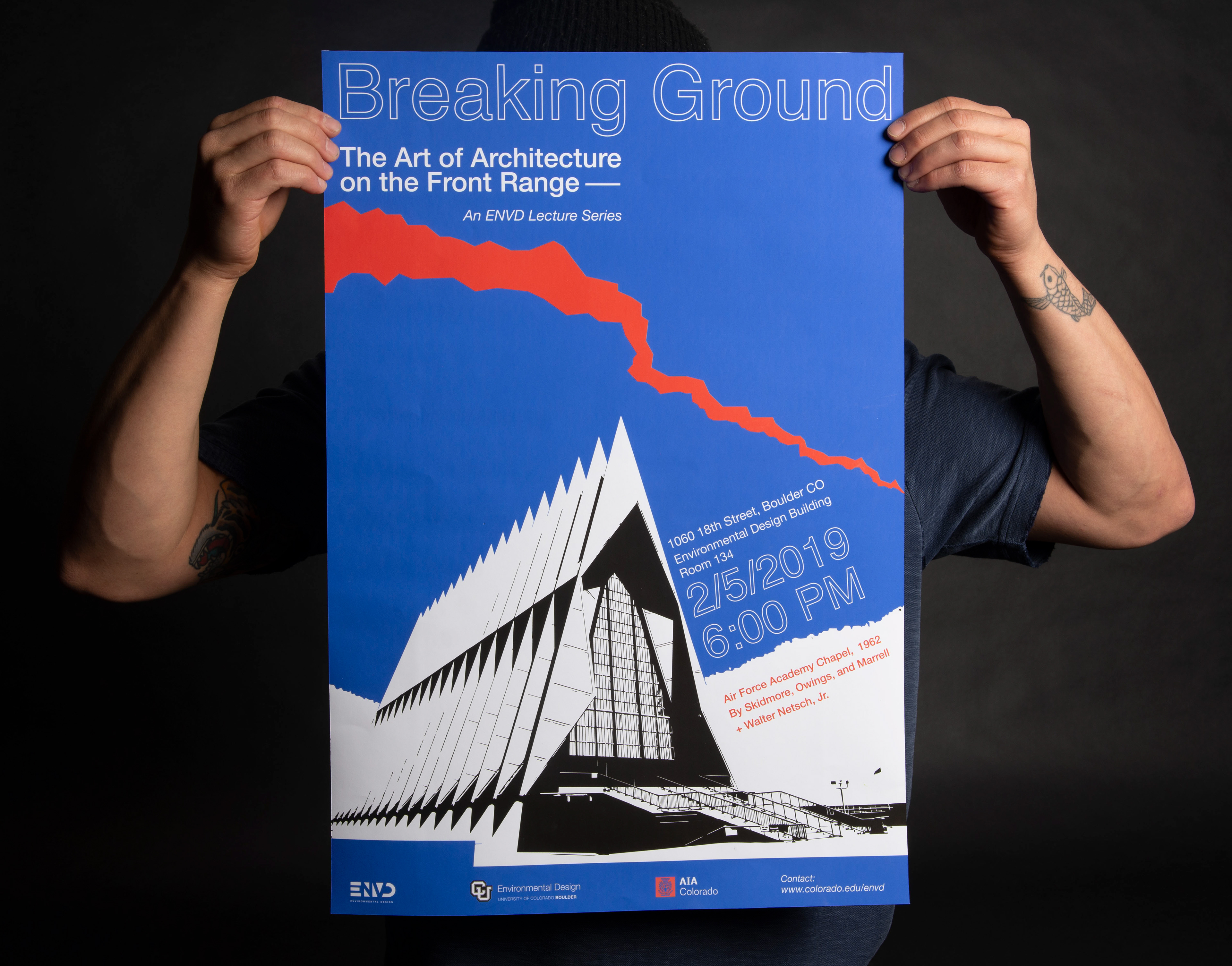 The Breaking Ground poster series stands out through bright colors and high contrast while maintaining graphic subtlety. The consistent crack on each of the spreads signifies the "Break" in the ground and provides a guiding visual element for your eye to follow. I limited myself to one font family but played with the scale, density and spacing to develop hierarchy. This series was influenced and inspired by pop art, as well as, German and Swiss graphic design.