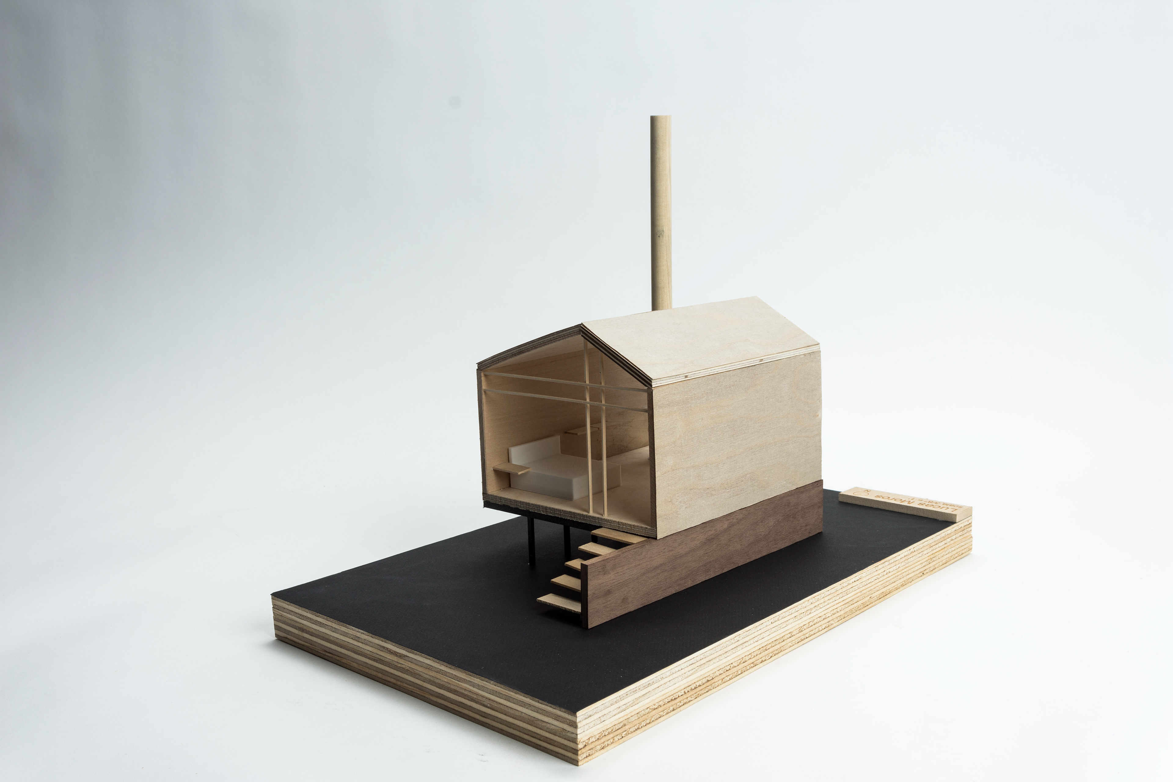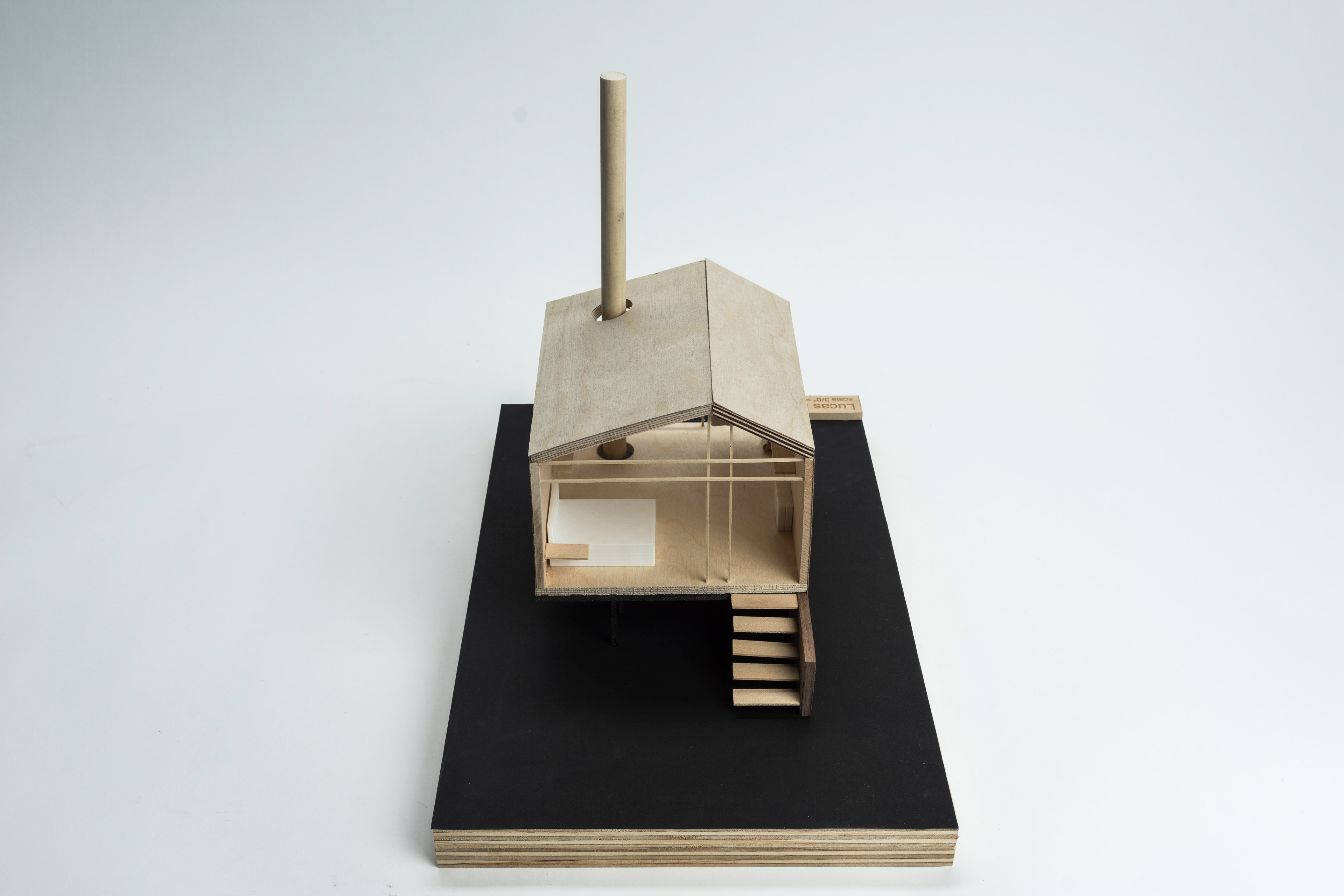 The Pine Cabin is proposed to be a 600 square foot temporary dwelling unit for people visiting and celebrating events on the Garrett Fields site located in Louisiana. Given the square footage restriction a minimalist approach was taken in order to maximize open floor space. An increasingly open floor plan allowed for the uniquely tall pine trees on the site to be incorporated as both structural support and as a central lighting fixture for each unit. Four ring shaped light fixtures will be connected to the portion of the tree trunk inside each cabin, this is intended to create a warm glow at night and celebrate the beauty of the tree within the cabin space and the greater site. The architecture of the cabin also takes into consideration the tendency for flooding on the site by being raised on a base of steel and concrete to wick away unwanted moisture.